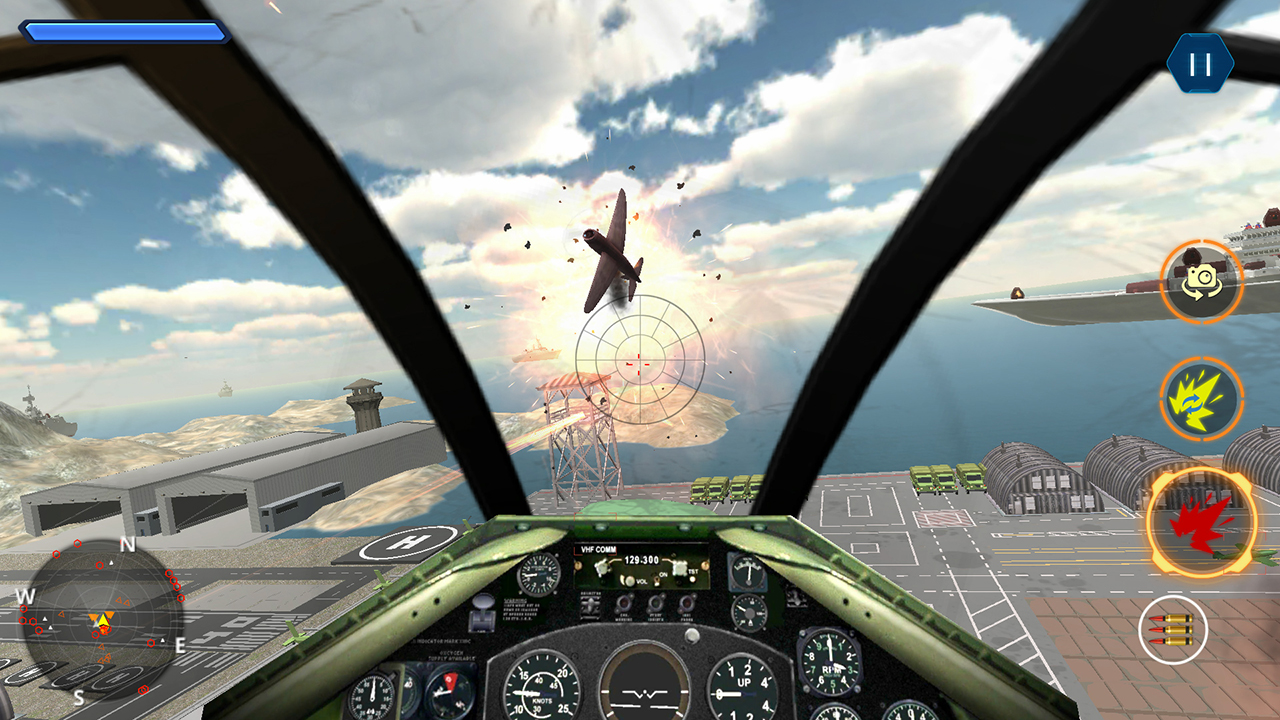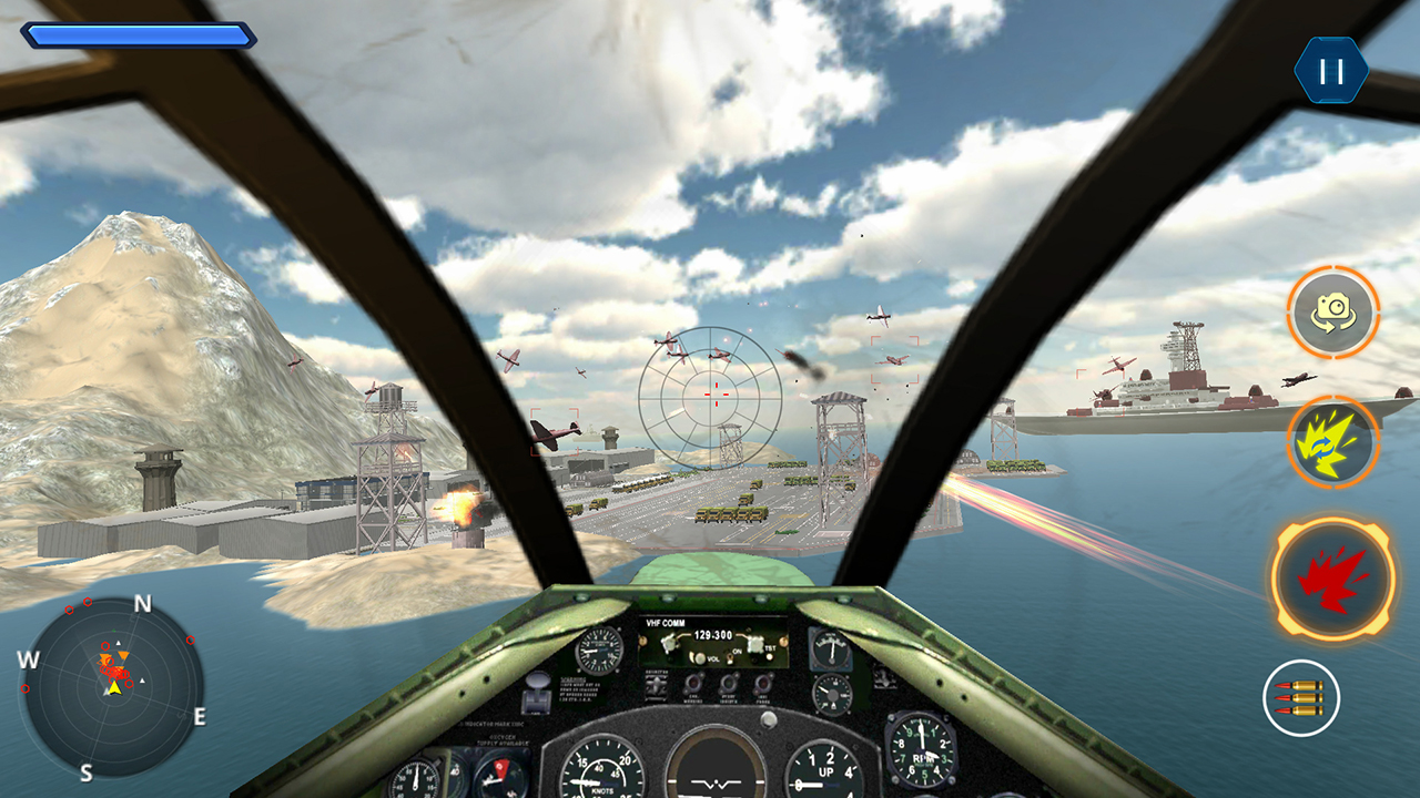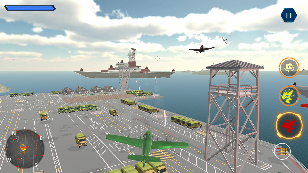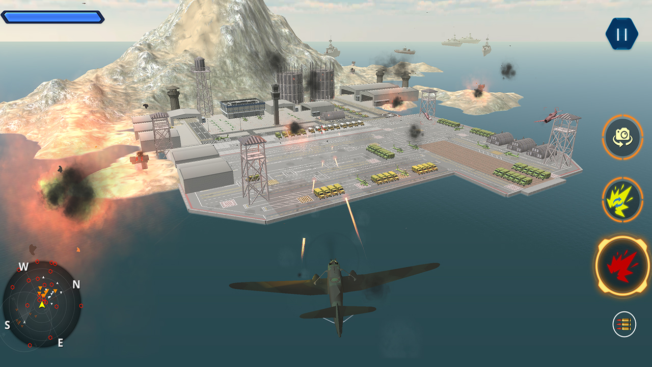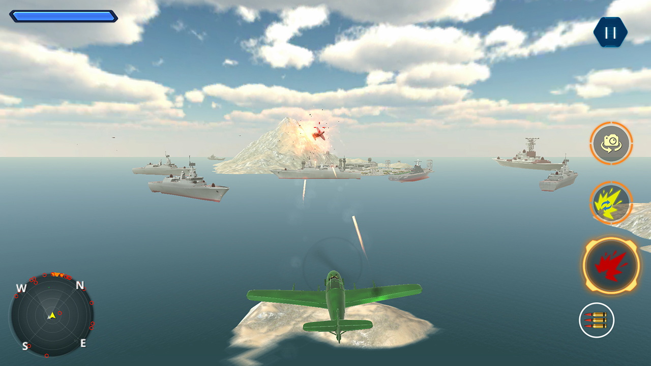 We have make it very easy to control your plane, just use the left virtual control to steer the plane when needed, and when you are near the enemy you keep taping to launch the weapon. Switch between different Weapons for each enemy type (Anti Craft Missile, Air-fighters, Tanks and War Ships).
